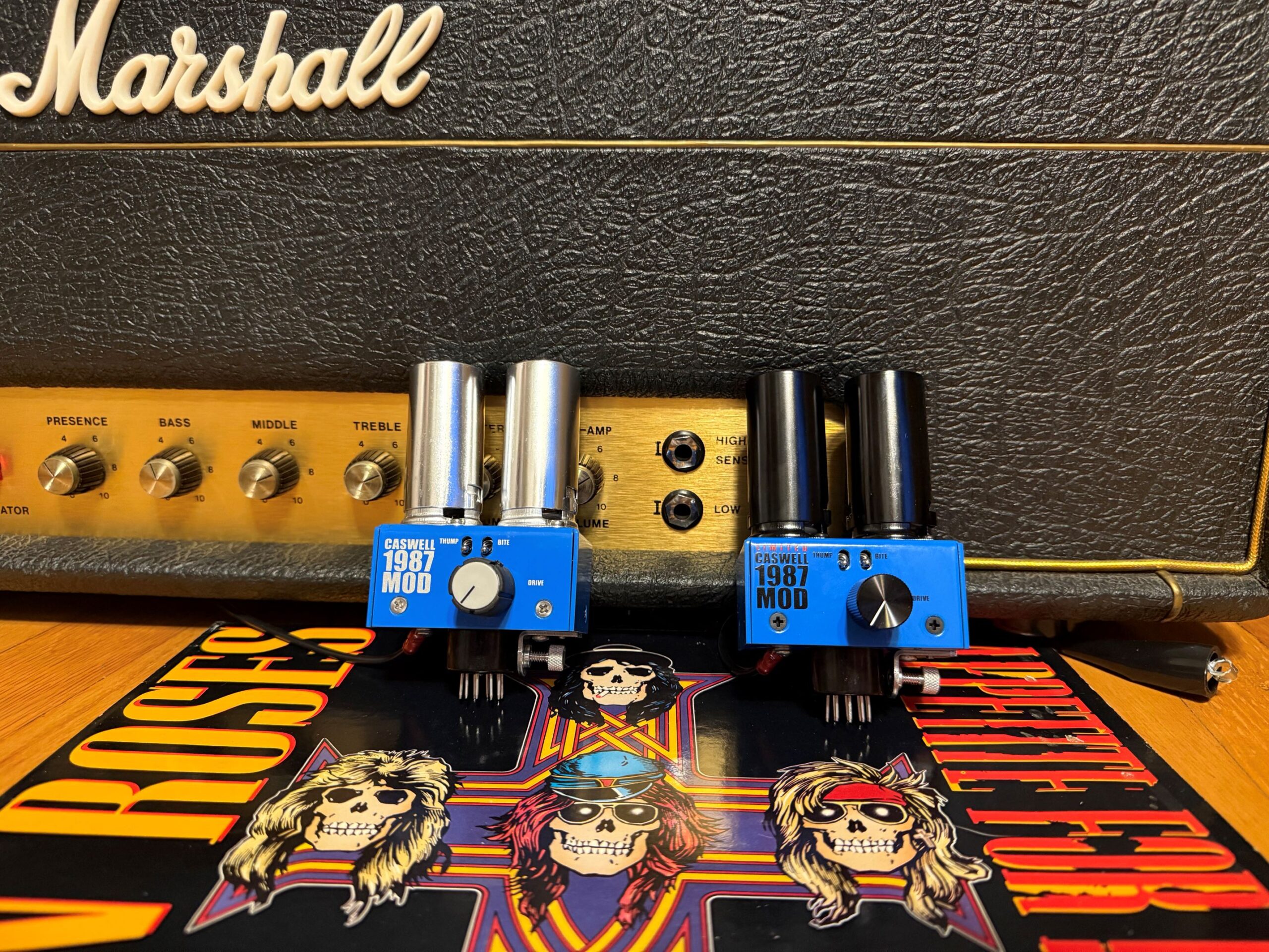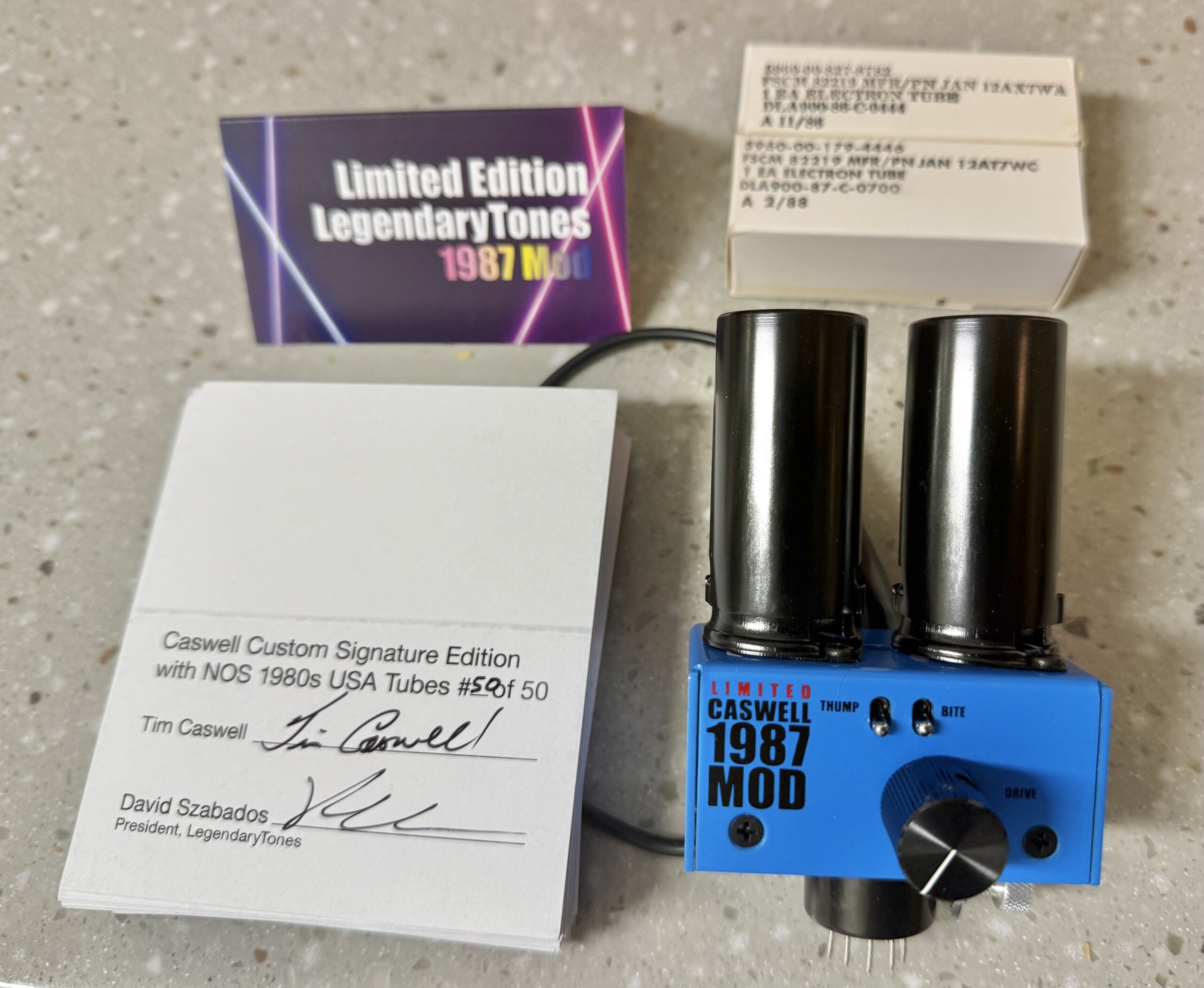 special. The Limited Edition Caswell 1987 Mod stands apart with striking blue-on-black aluminum hardware and knob, loaded with rare, genuine NOS ’80s USA-military grade Philips tubes (12AT7 and 12AX7), and includes a hand-signed Certificate of Authenticity from Tim Caswell himself. Only 50 units are being produced worldwide – each one a piece of rock history. Built to order in Standard or Reverse wire versions.