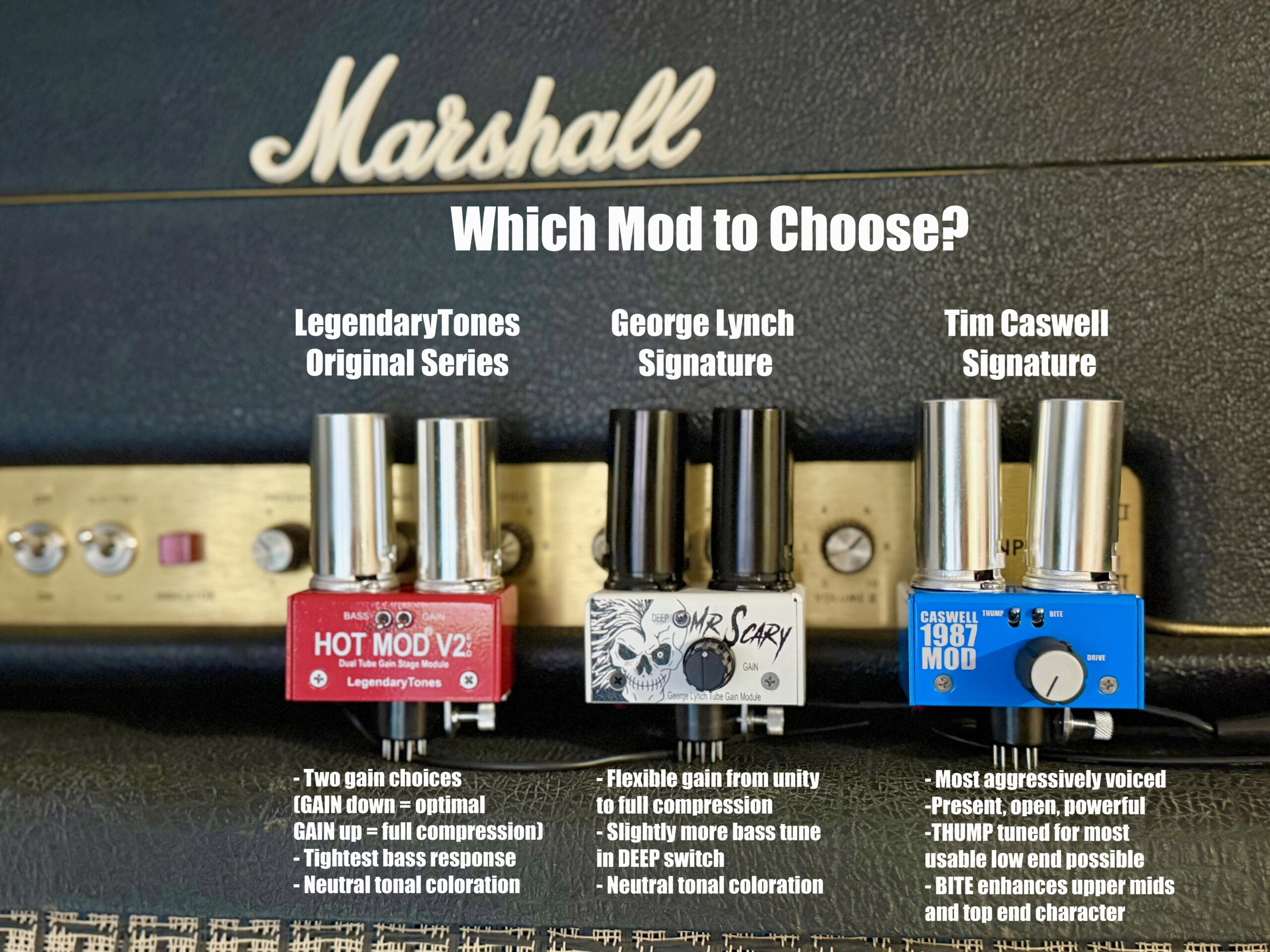 Each mod represents a different philosophy: the Hot Mod V2 Evo is the modern all‑rounder, the Mr. Scary Mod is a personalized artist signature, and the 1987 Mod is pure vintage attitude. Choosing between them depends on whether you want easy plug-and-play, Lynch’s dynamic voice, or the snarling bite of ’80s rock history. Be sure to also check out our compatibility page for various amp applications and more information!